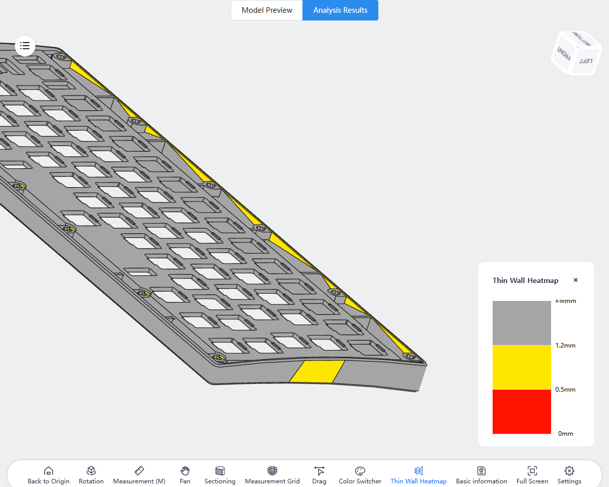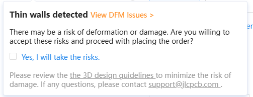 View DFM Issues를 클릭하면 모델 뷰어가 나온다. 모델 뷰어 상단 Analysis Results를 눌러서 문제가 되는 부분이 어디인지 확인하고 해당 부분을 수정을 하거나, 그대로 주문을 해도 괜찮을 것 같으면 Yes, I will take the risks. 를 체크하고 진행하면 된다.