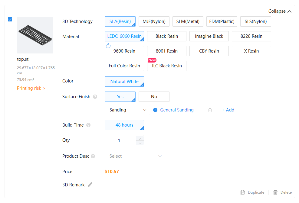 상판이랑 하판은 LEDO6060이랑 9600 Resin 중에 고민을 했는데, 직원에게 문의를 해보니 치수 안정성은 거~의 똑같은 정도라고 해서 약간 더 저렴하고 강도가 좋다고 설명되어 있는 9600 레진을 골랐다.