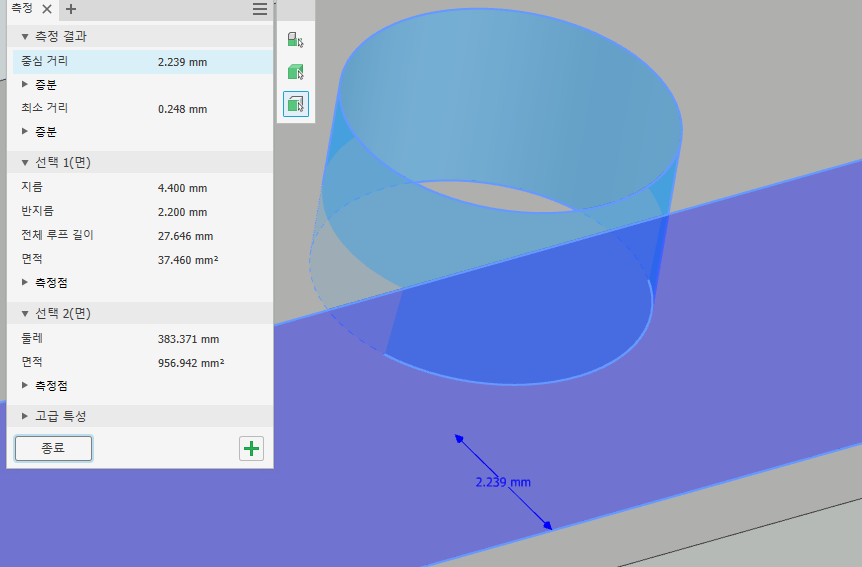 상하판 결합 나사홀과 무게추쪽 면과의 거리가 너무 짧아서 가공하면 무조건 터질 거 같아서 무게추 사이즈를 줄이고 벽 두께를 늘렸습니다.