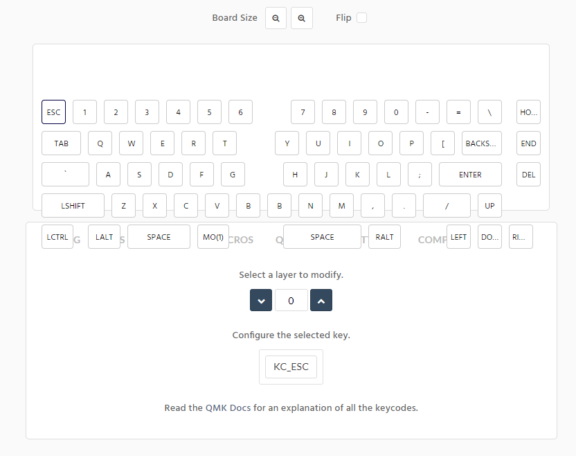 사이트 상단 board size 조절 버튼과 flip 버튼을 활용해서 keymap 메뉴를 열어줍니다..